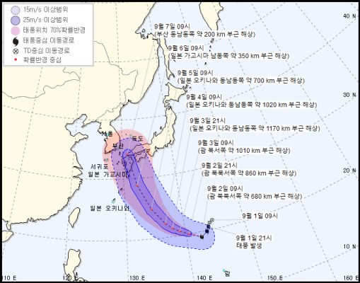 내륙에 접근할 7일 오전 3시에는 중심기압은 945h㎩에, 최대풍속은 시속 162㎞(초속 45m), 강풍반경 440㎞까지 성장할 것으로 보입니다.