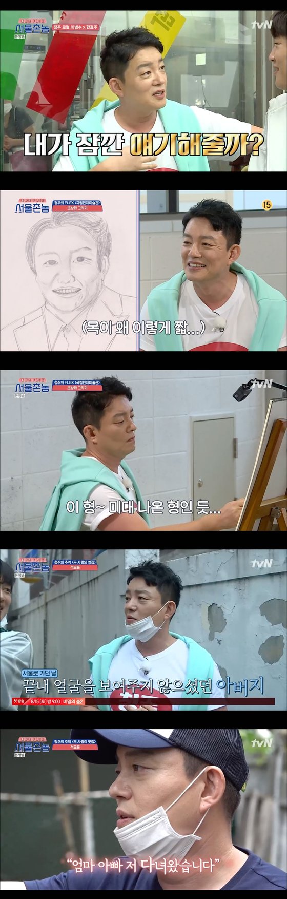하지만 국립현대미술관 청주관에서 진행된 '서울촌놈 청주편 초상화 발표회'에서는 거침없는 손놀림의 전문과 포스와는 전혀 다른 식스센스급 반전의 미완성 초상화로 '심령파 화가'라는 별명을 얻으며 현장을 초토화시켰습니다.차태현과 짝을 이뤄 부모님과 어린 시절을 보냈던 석교동을 찾은 이범수는 기억 속의 길은 남아 있었지만 집은 없어지고 터만 남은 골목길을 거닐며 "아빠 저 왔어요 하면 나오실 것 같아"라며 어린 시절 가장 건강하셨던 부모님에 대한 그리운 마음을 담담히 고백하는 것은 물론 촬영이 끝난 후에도 골목을 다시 찾아 "갈게요 아버지, 언젠가 소을이 다을이랑 와보고 싶다"며 진심 어린 마음을 고백하는 인간적인 면모로 시청자들을 뭉클하게 했습니다.16일 오후 10시 50분 두 번째 청주 편이 방송됩니다.김진석