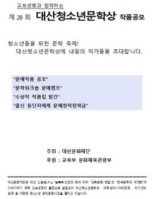 금상 수상자는 각 150만원, 은상 수상자는 각 70만원, 동상 수상자는 각 50만원을 받습니다.심사에는 시 부문 심재휘, 이수명, 황인찬 시인, 소설 부문 구효서, 박금산, 윤해서, 황선미 소설가가 참여했습니다.대산청소년문학상은 공모를 통해 받은 작품 중 수상후보를 선발한 뒤, 2박3일간 문예캠프와 백일장을 실시해 최종수상자를 선정해왔습니다.