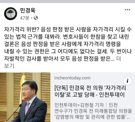 민 전 의원은 앞서 올린 글을 통해 지난달 15일 광화문 집회에 참석한 후 두 차례 진단검사에서 ‘음성’ 결과를 받았다고 밝혔습니다.