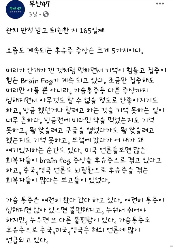 그는 "완치 판정을 받은 지 다섯 달 반이 지났지만 전혀 완치되지 않았다”며 “미국·중국 발표나 미국·영국·이탈리아 등 언론을 보면 후유증 환 자 관련 글이 계속 나오는데 한국은 그렇지 못하다”고 했습니다.