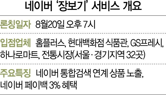 네이버가 새롭게 론칭하는 ‘장보기’ 서비스에 홈플러스 등 대형마트부터식품관, 온라인몰인 GS프레시몰까지 줄줄이 입점하고 나선 것입니다.