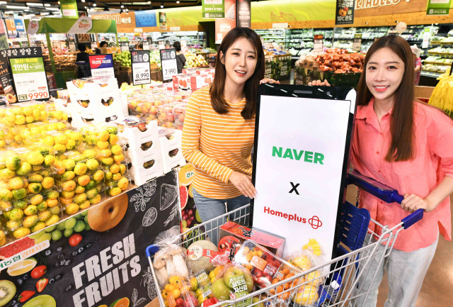 viewer 홈플러스 강서점에서 모델들이 네이버 ‘장보기’ 서비스를 소개하고 있습니다.